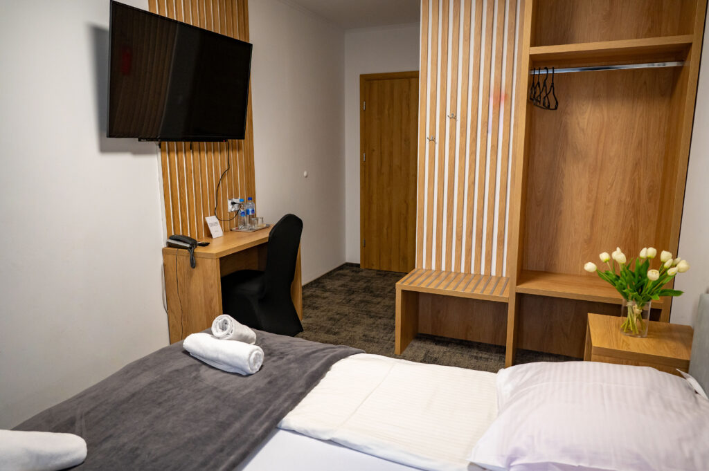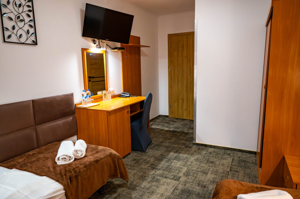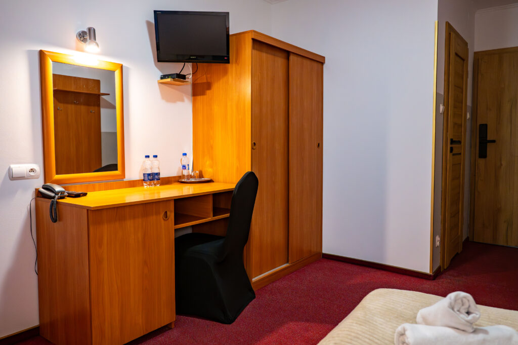 Każdy z pokoi wyposażony jest w łazienkę z kabiną prysznicową, biurko, telewizor. Lodówka oraz suszarka dostępne są na życzenie Gości.
